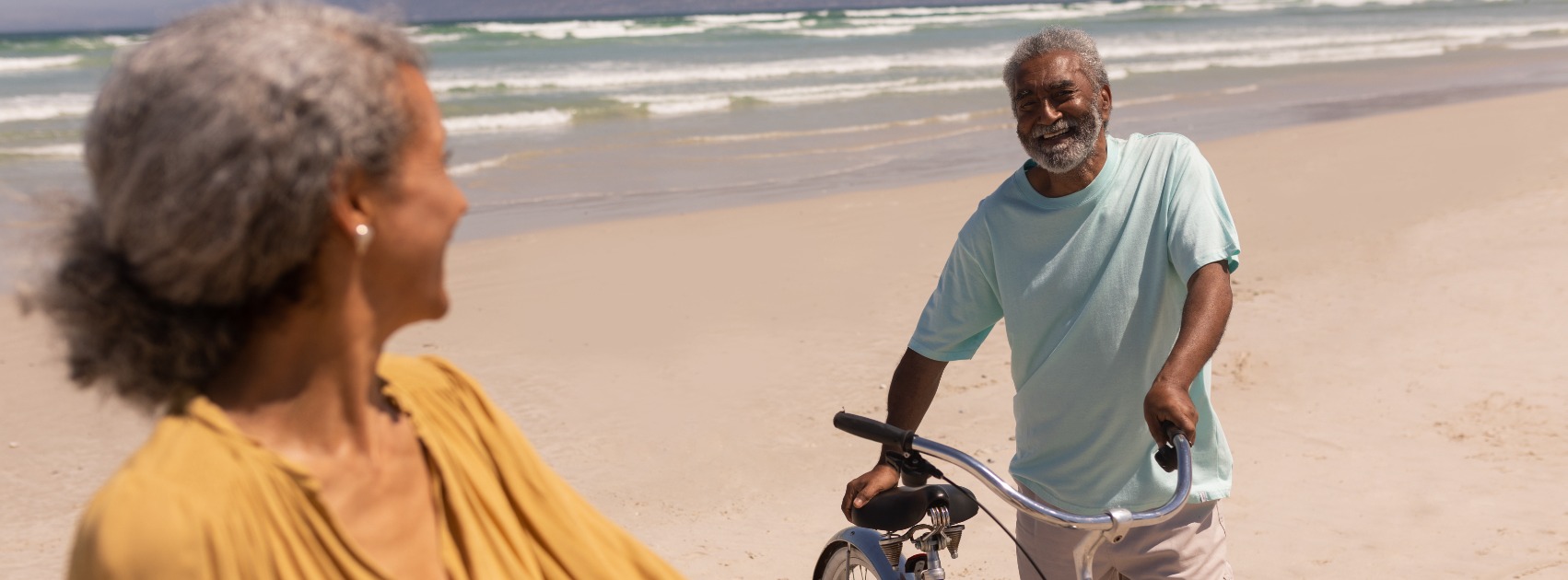 Happy senior retired couple standing with bicycle and looking each other on beach in the sunshine with mountains in the background
